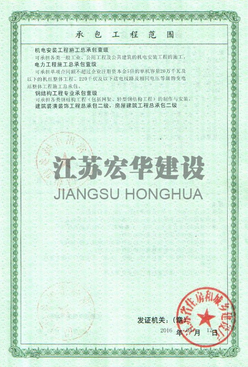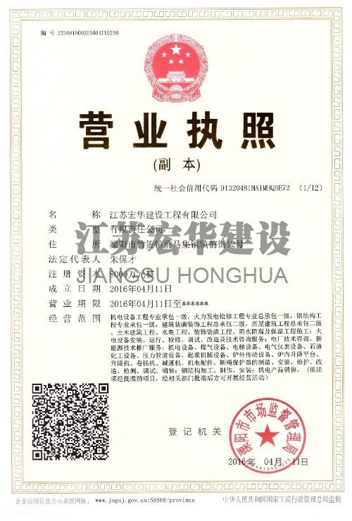 江苏宏华建设工程有限公司位于江苏省建筑安装之乡溧阳市,创建于1976年,注册资本500万人民币,原为地方企业溧阳县安装建筑工程公司。在2006年改为民营企业—溧阳市工程建筑安装有限公司。在邓小平理论改革开放搞活经济的潮流中,经过企业的成绩达到了以经济为一体综合实力很厚的企业,成为江苏省骨干企业,综合水平达到了标准,在电力安装检修有较强的安装水平和实力,范围涉及到升降平台安装、机电安装、锅炉安装、电梯设备、起重机械设备、钢结构、煤气设备、市政工程等;有着丰富的经验。在各大电厂得了好评,同时有RT、UT、MT、PT实验五大类二十九项检验检测资格。在2016年企业更名为:江苏宏华建设工程有限公司。现注册资本8000万元。
