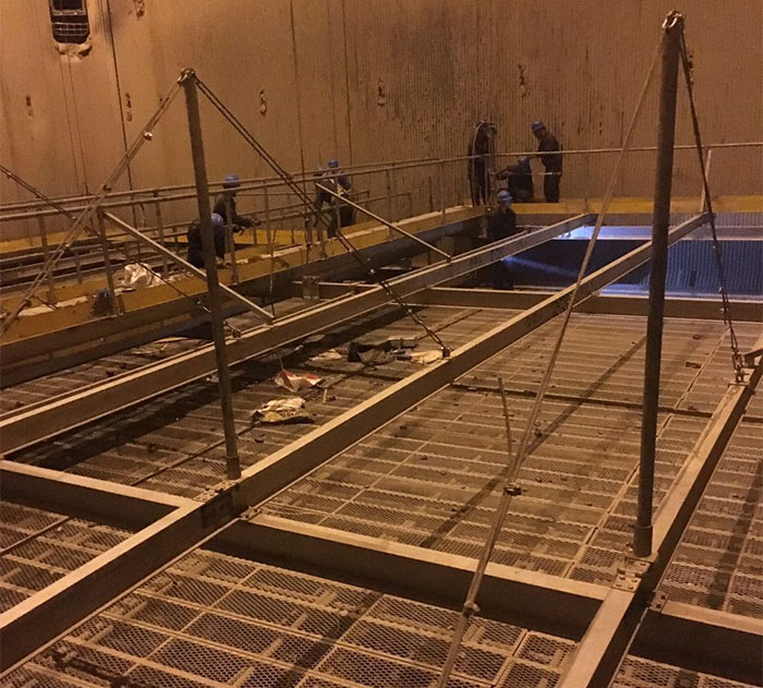 项目概述:炉内升降平台安装前,应重点进行如下检查:(一)检查主梁、副梁和铺板是否有变形、损伤、弯曲、裂纹等现象,判断能否继续使用。(二)检查支壁装臵伸缩是否正常。(三)检查各部连接件和紧固件变形、损伤等,螺栓、螺母、猫爪等发现损坏禁止使用。(四)检查各钢丝绳有无磨损、断股、锈蚀等现象,钢丝绳直径是否符合设计要